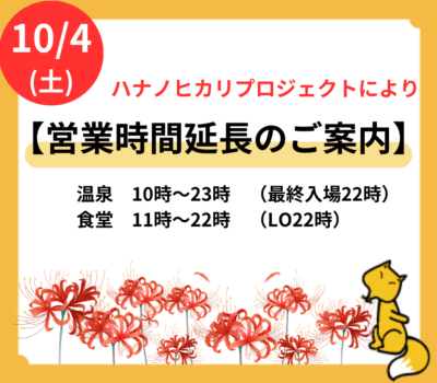 日頃よりご利用いただきありがとうございます。 皆さまにもっとゆったりとお過ごしいただけるよう、10月4日限定で温泉・食堂の営業時間を延長いたします✨ ‐‐‐‐‐‐‐ 🕒 <営業時間> ♨️ 温泉 10:00~23:00( […]